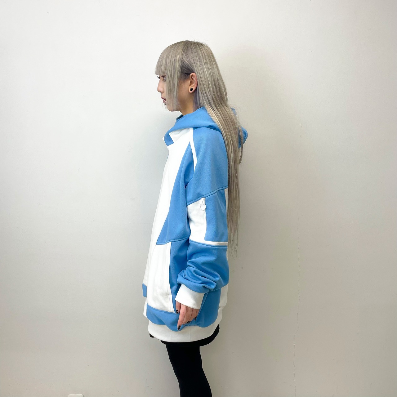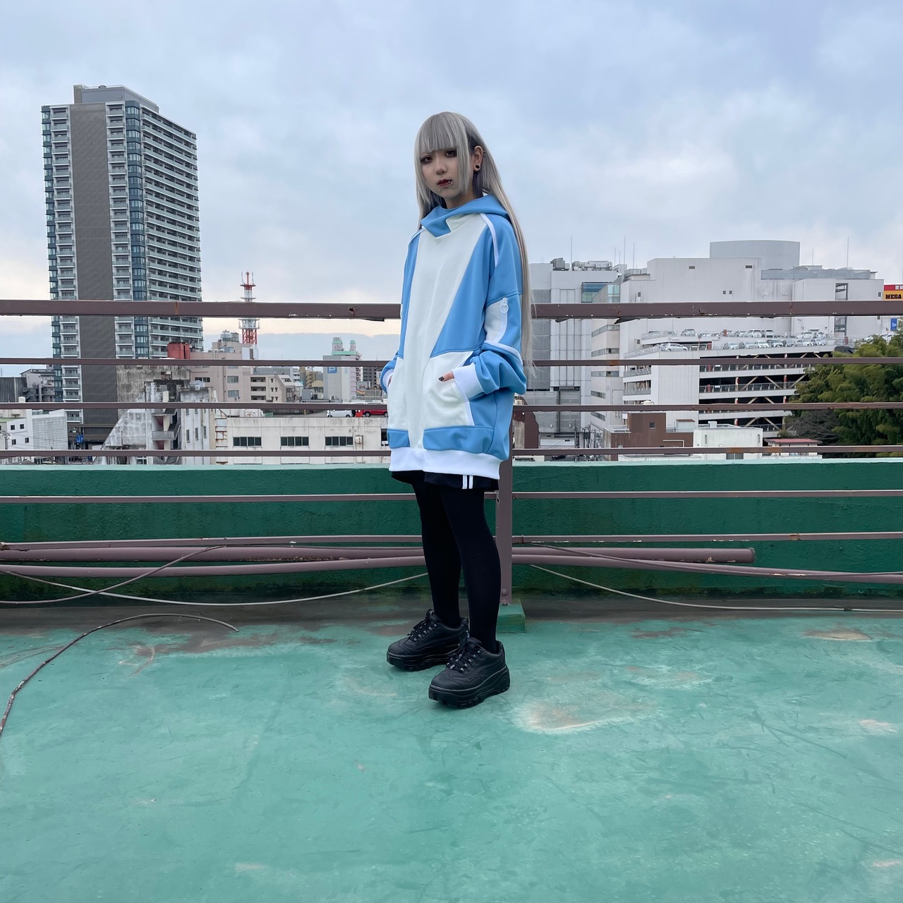 白のスウェット素材と水色のジャージ素材で作られたパーカー