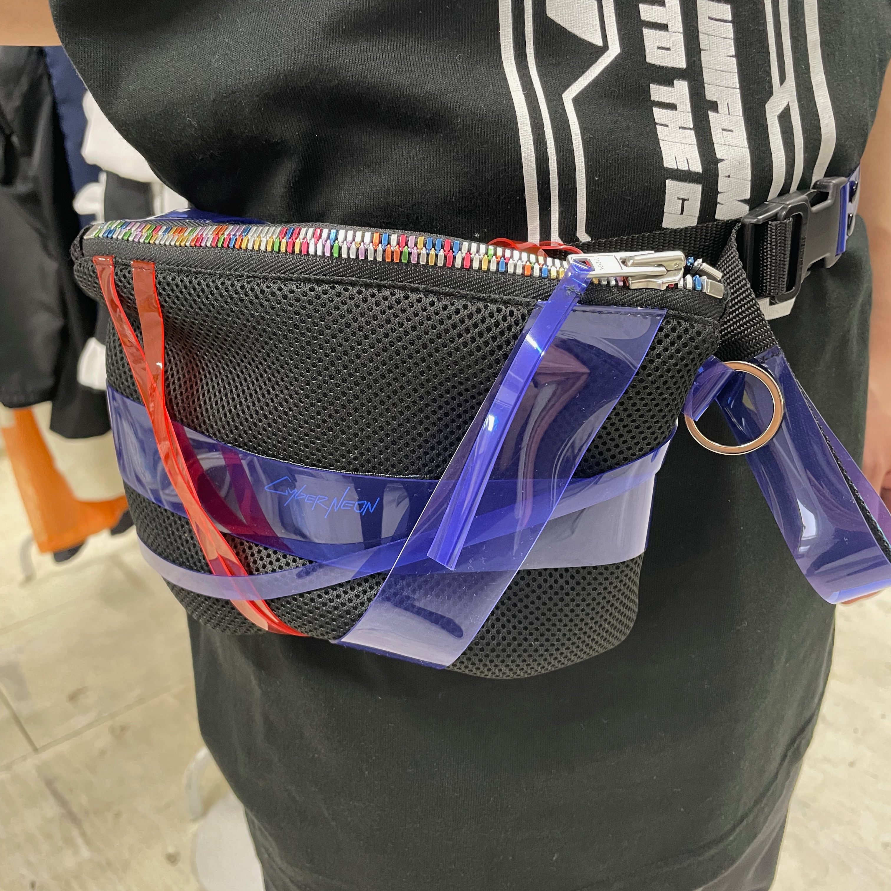 交差するPVCのラインが美しい未来的なデザインのポーチです